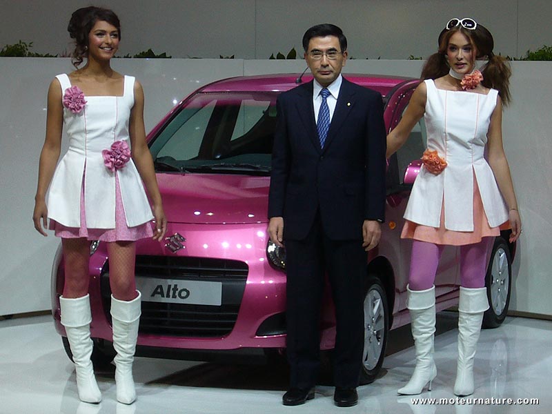 Il y a toujours de jolies femmes lors des présentations Suzuki. C'était Carla Bruni au salon de Paris en 1998, et nous ignorons encore si l'un des mannequins présents cette année épousera un futur président, mais nous voyons que Suzuki recherche une clientèle féminine pour sa nouvelle Alto. La couleur rose acidulé choisie pour cette première ne laisse aucun doute. Il s'agit d'une auto premier prix, qui sera importée d'Inde, version de série du concept A-Star, qui avait été dévoilé au salon de New Delhi.