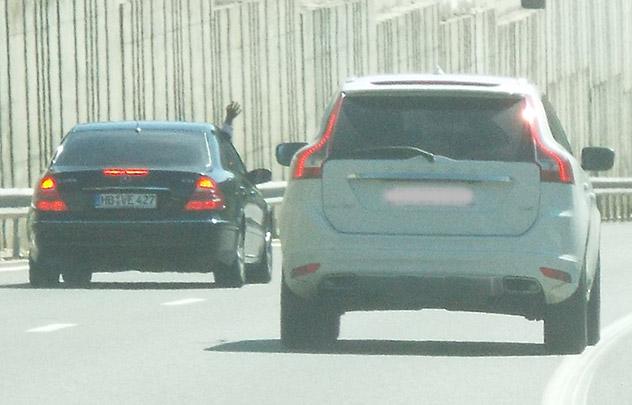 On fait parfois de bonnes rencontres sur la route, mais il y en a aussi de mauvaises. C'est ce second possible qui sera relaté ici. Cela se passe sur l'autoroute blanche (A40), en France, mais tout près de Genève. Des voitures allemandes, puissantes, avec à leur bord, des hommes qui font de grands signes, avec appels de phares et feux de détresse, pour inviter les autres automobilistes à s'arrêter sur la bande d'arrêt d'urgence, parce qu'il y a une urgence. Ce sont notamment une Mercedes classe E immatriculée HB VE 427 et une Audi A8, DU HQ 258.L'urgence en question est de prendre l'argent et les cartes de crédit qui sont dans vos poches, pour les mettre dans les leurs. Ces gens arrêtent les automobilistes au prétexte qu'ils n'ont plus l'argent dont ils ont besoin pour acheter du carburant, et rentrer chez eux, en Allemagne, alors que les enfants pleurent sur le siège arrière ! Leur aspect, derrière le costume, est de membres de la communauté des gens du voyage. Ils donnent des cartes de visite (ça coûte pas cher), et ils sont prêts à laisser en gage à l'automobiliste qui leur ferait confiance une grosse bague en or (100 % toc).